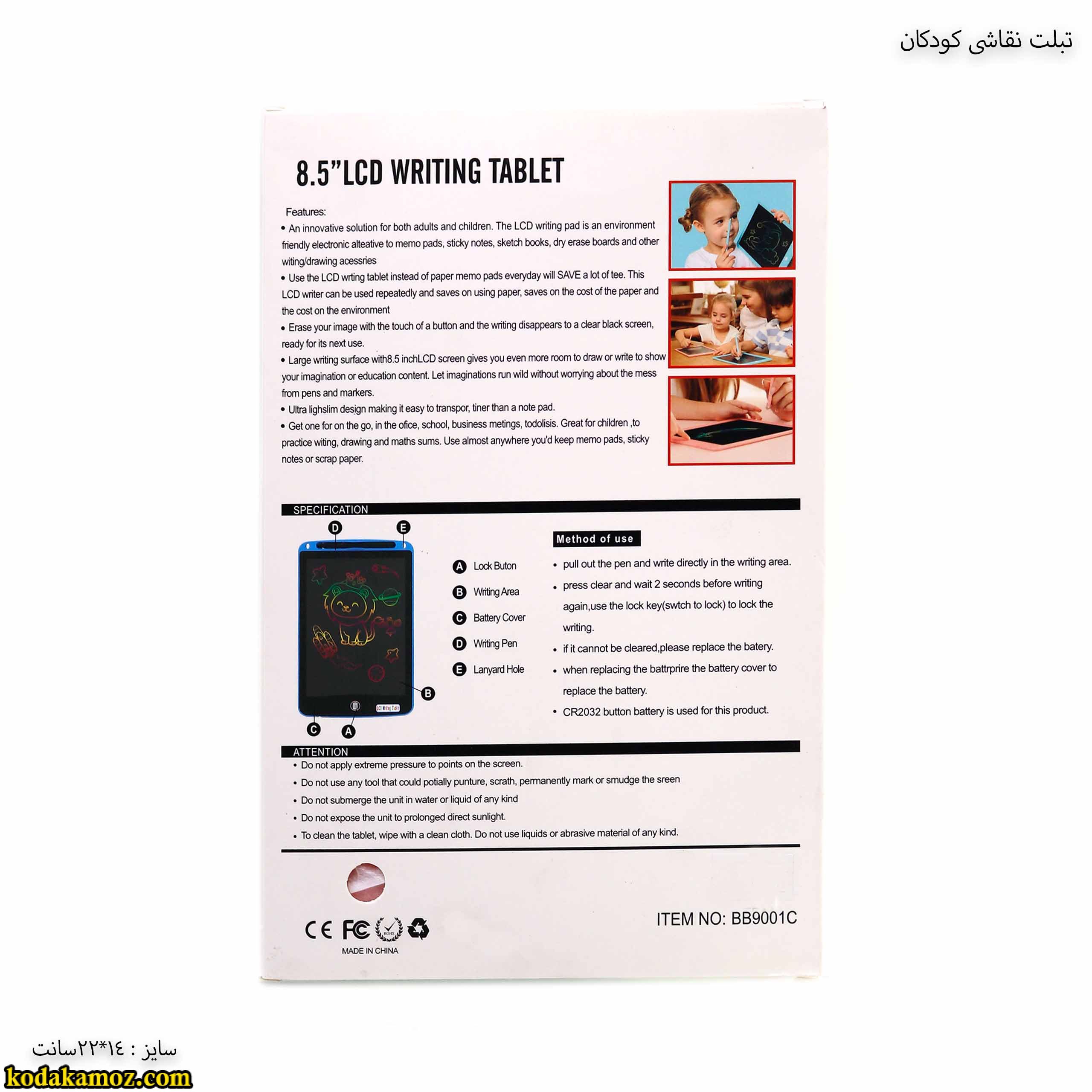 صفحه تبلت نقاشی کودکان به صورت LCD می باشد که می توان روی صفحه ان نقاشی، طراحی و یادداشت نوشت که با فشار دادن دکمه touch نوشته ها یا طراحی پاک می شود. این تبلت یک عدد خودکار مخصوص دارد و دکمه ای جهت روشن و خاموش کردن دارد