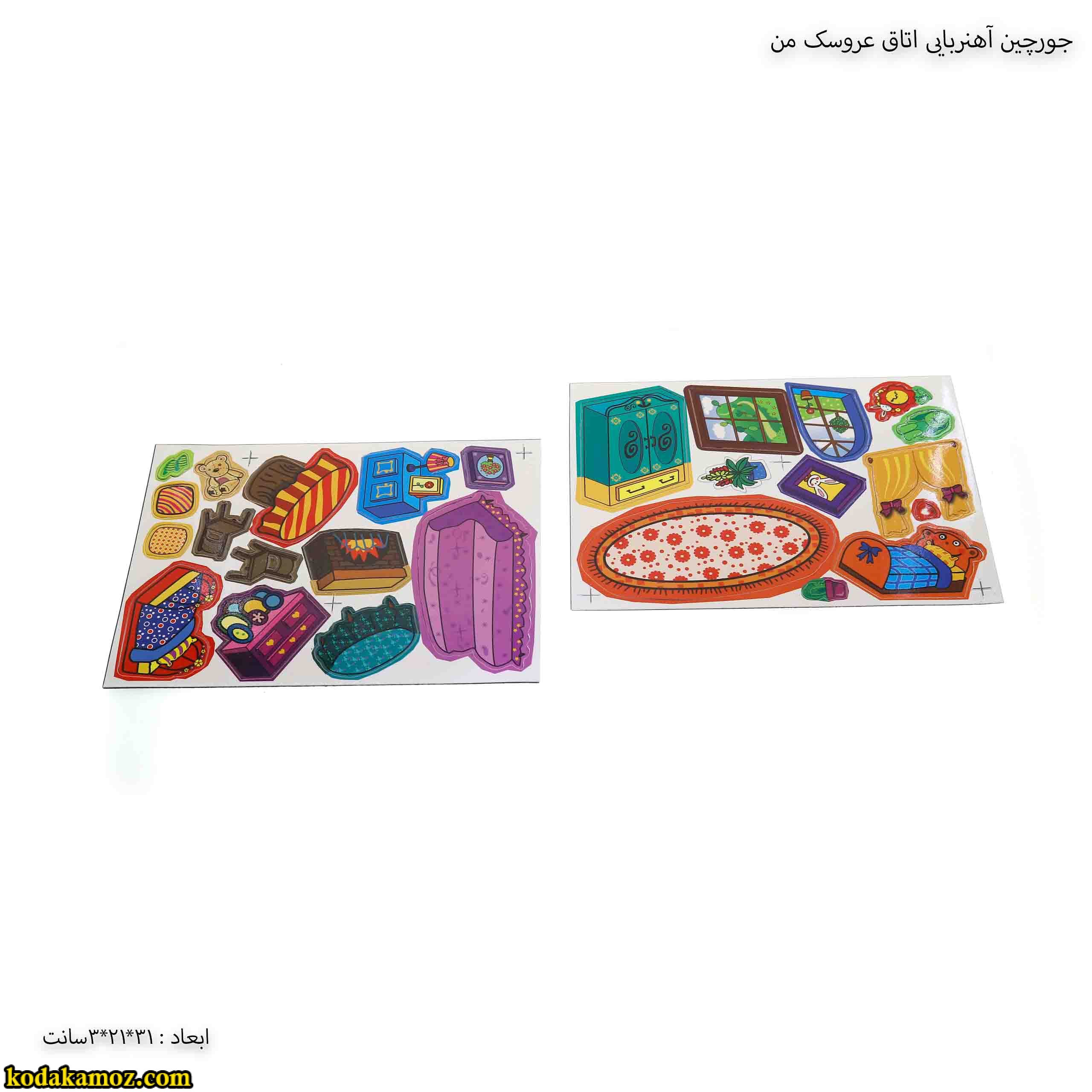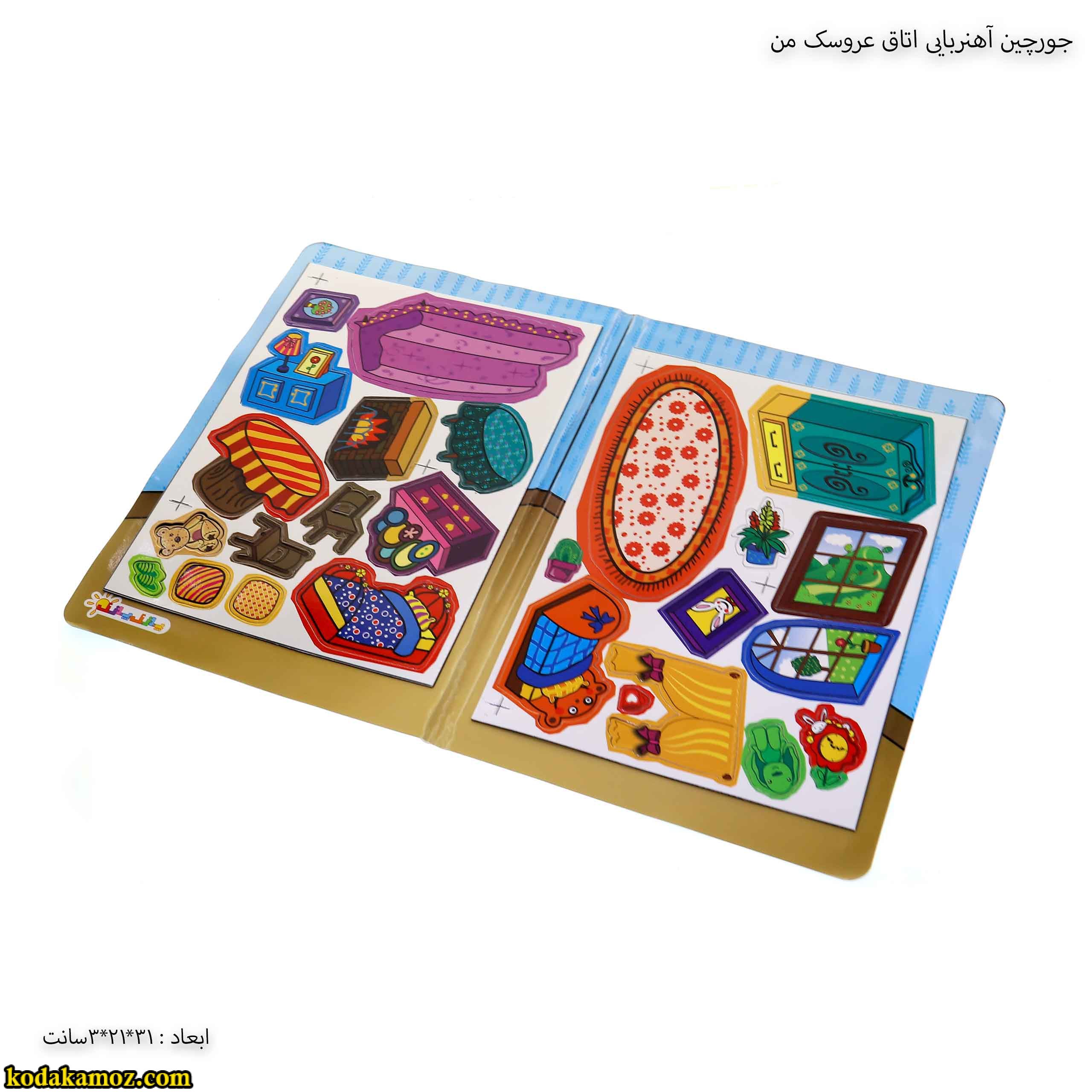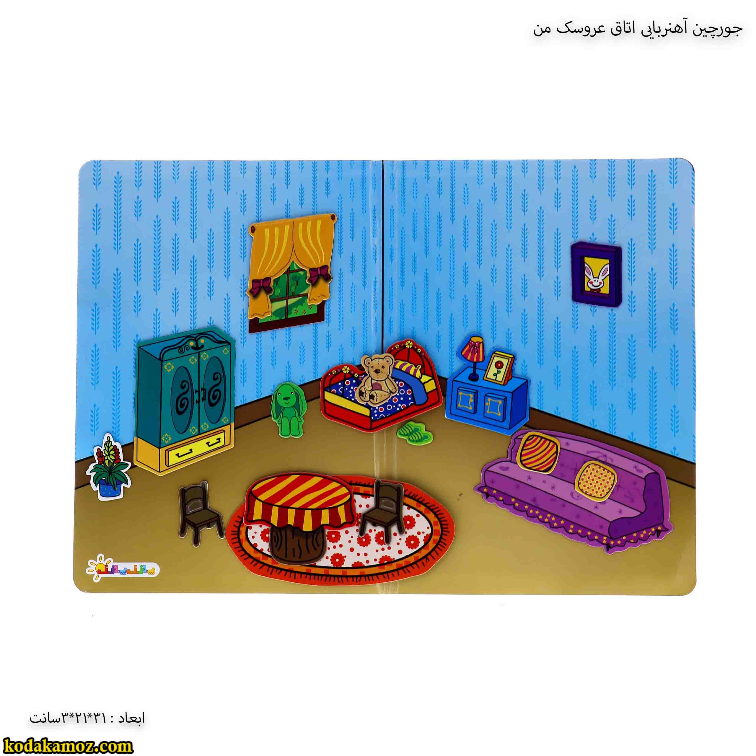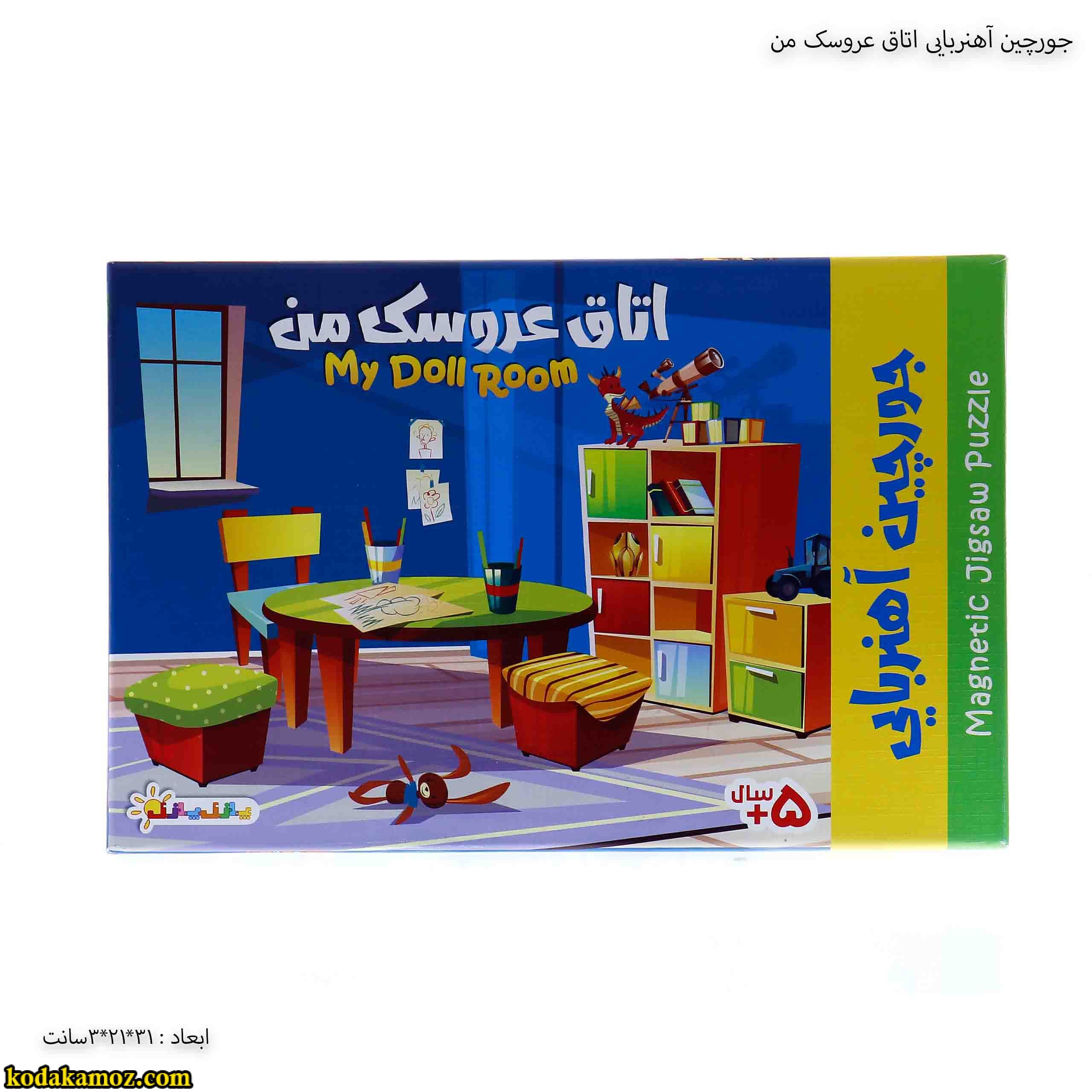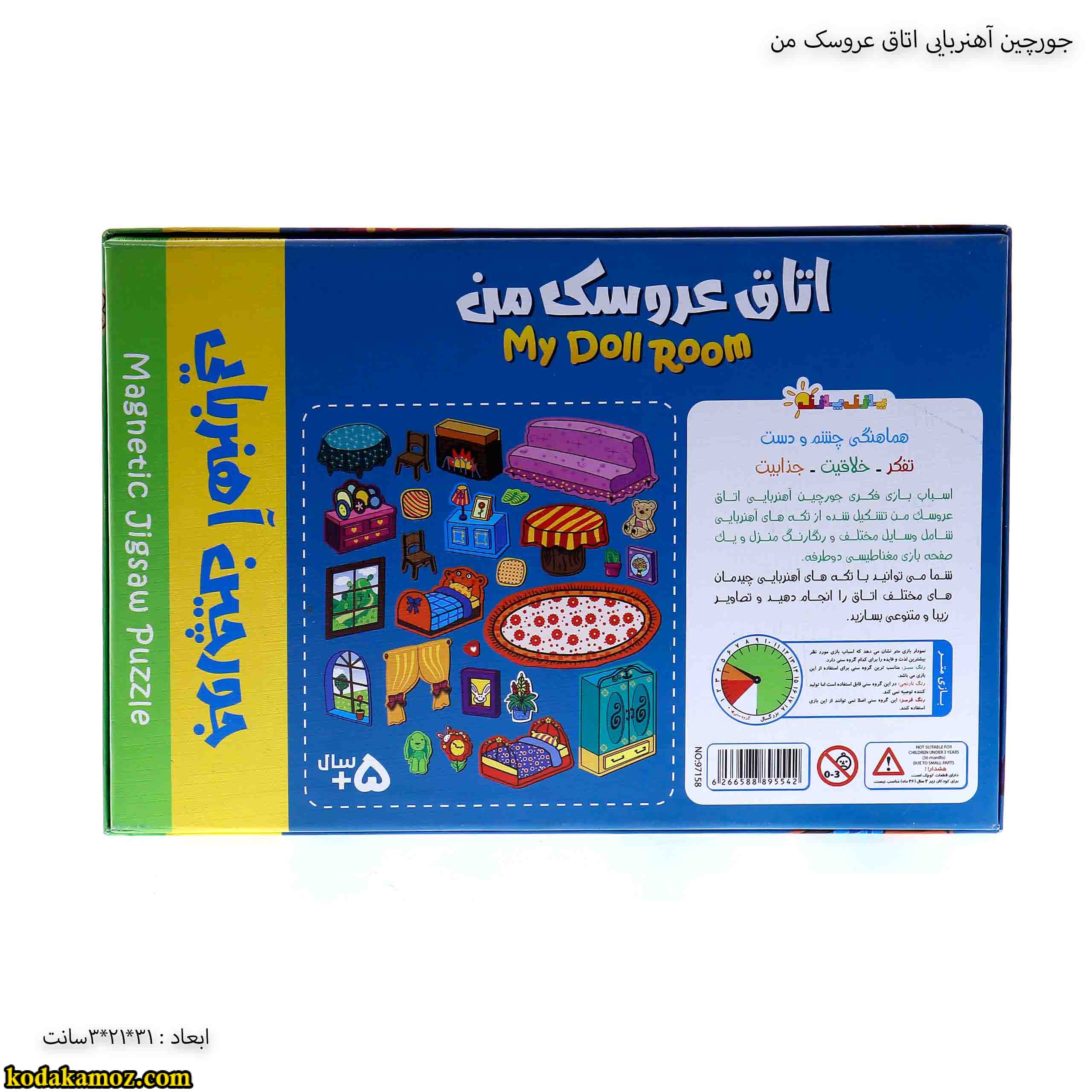 اسباب بازی فکری جورچین آهنربایی اتاق عروسک من تشکیل شده از تکه های آهنربایی شامل وسایل مختلف و رنگارنگ منزل و یک صفحه بازی مغناطیسی دوطرفه است.شما میتوانید با تکه های آهنربایی چیدمان های مختلف اتاق را انجام دهید و تصاویر زیبا و متنوعی بسازید.