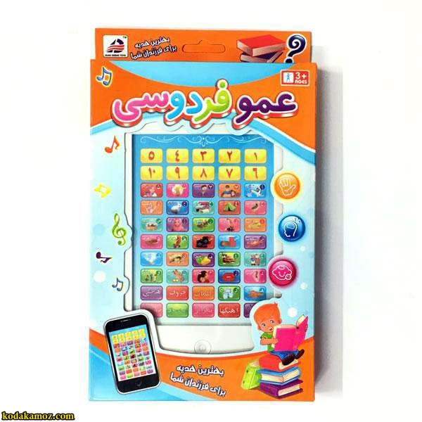 تبلت لمسی عمو فردوسی ” کودکان شما به وسیله این وسیله آموزشی می توانند الفبا را آموزش ببینند و یاد بگیرند. این تبلت برای شروع به کار به سه عدد باتری قلمی نیاز دارد و پس از اینکه روشن شود با قرار دادن انگشت بر روی هر تصویر فرمان آن را انجام میدهد و چندین روش آموزش در این تبلت می باشد
