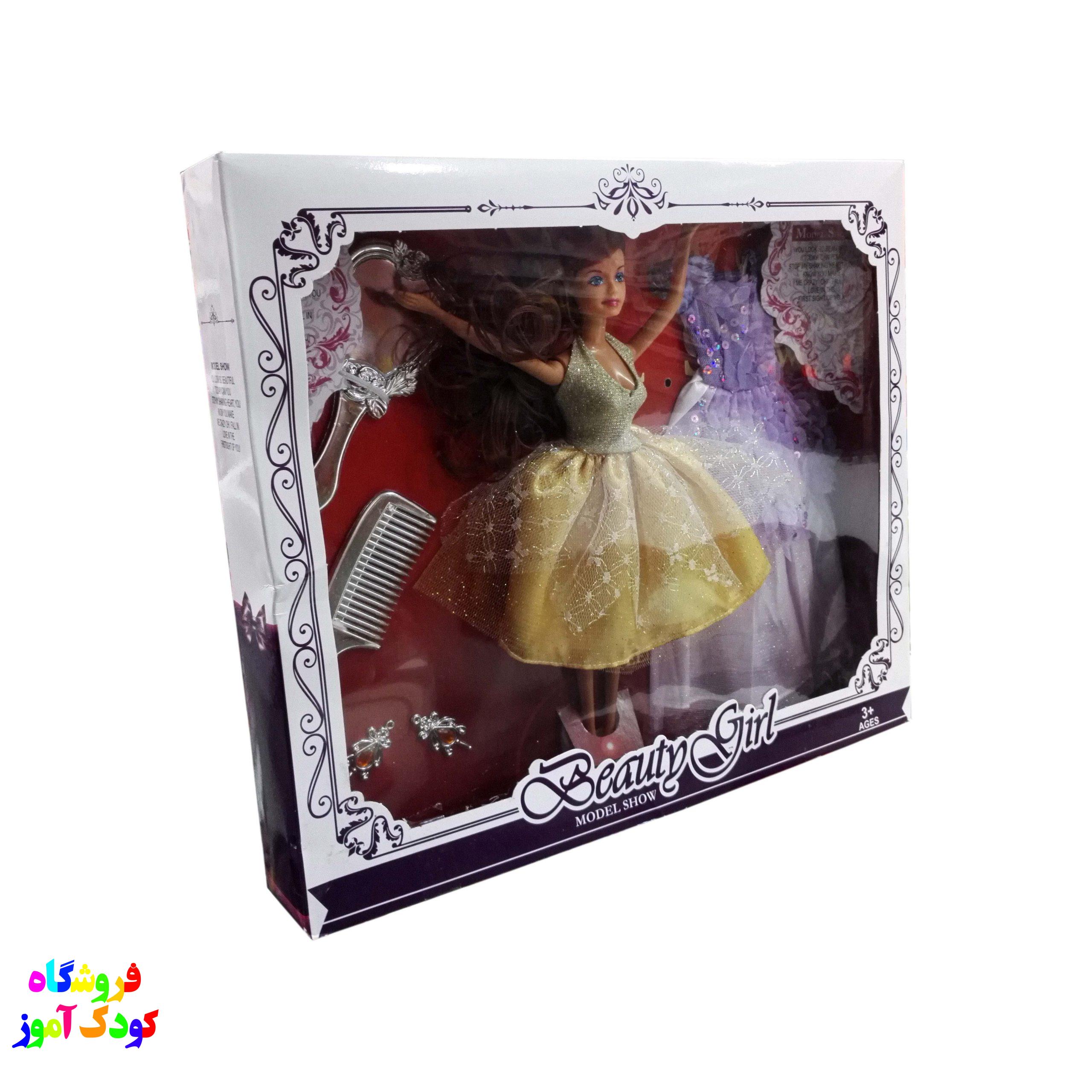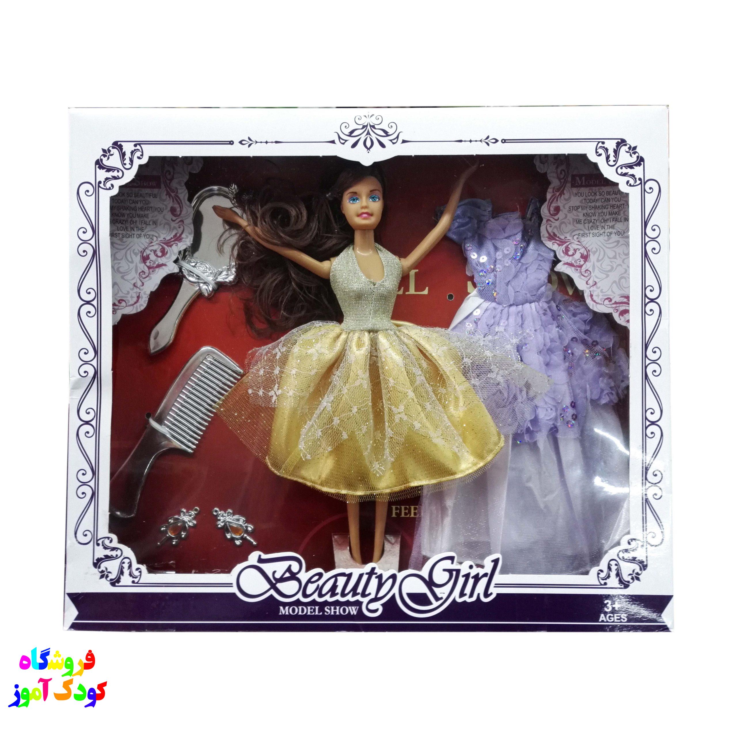 ویژگی ها : عروسک باربی با لباس مخصوص ، دارای لباس و یک آیینه طرح قلب ، یک عدد شانه و کیف دستی