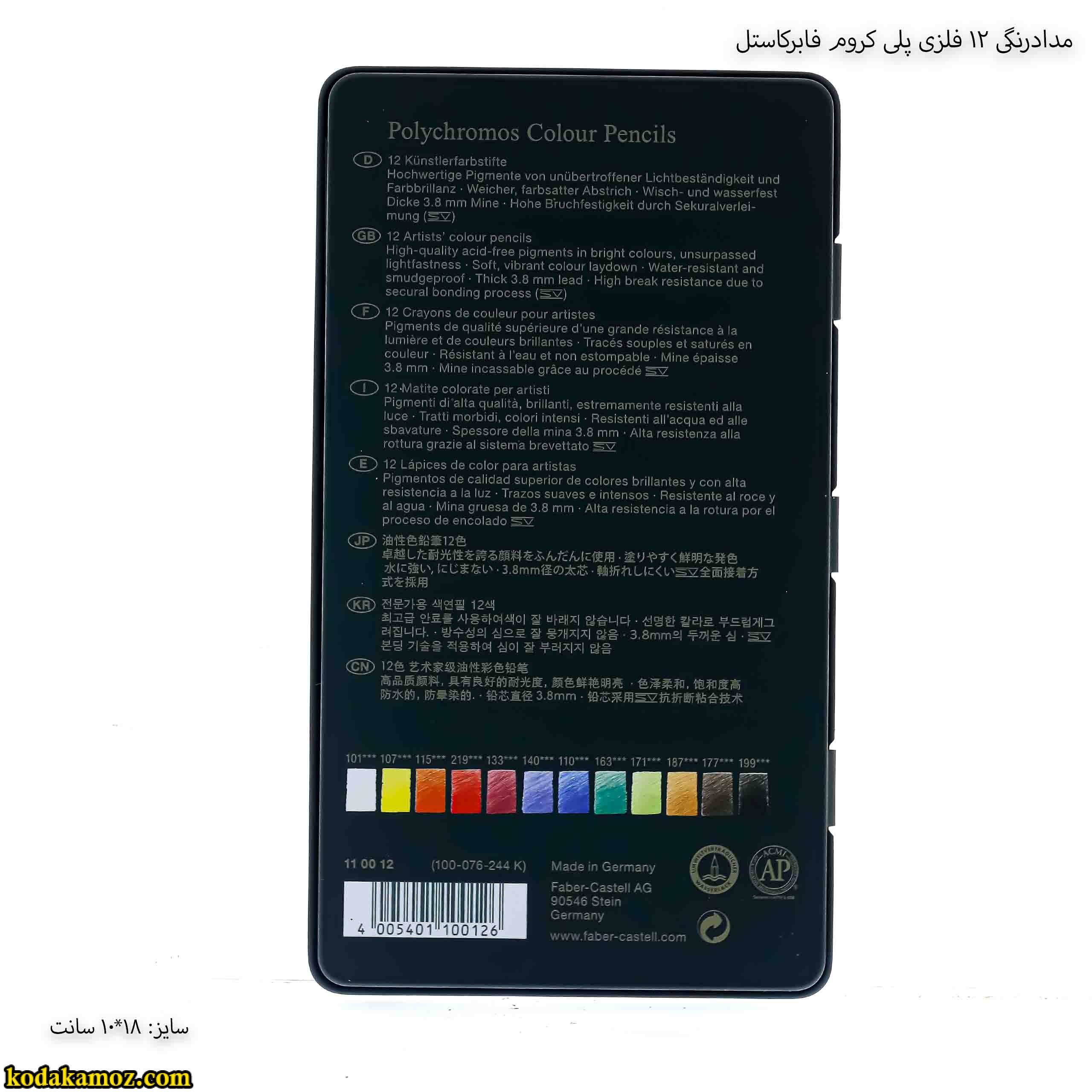 مداد رنگی 12 فلزی پلی کروم فابرکاستل بسیار عالی هست برای نقاشان حرفه ای چون قیمت بالایی داره به همه توصیه نمیکنم فقط کسانی که حرفه ای کار میکنن.