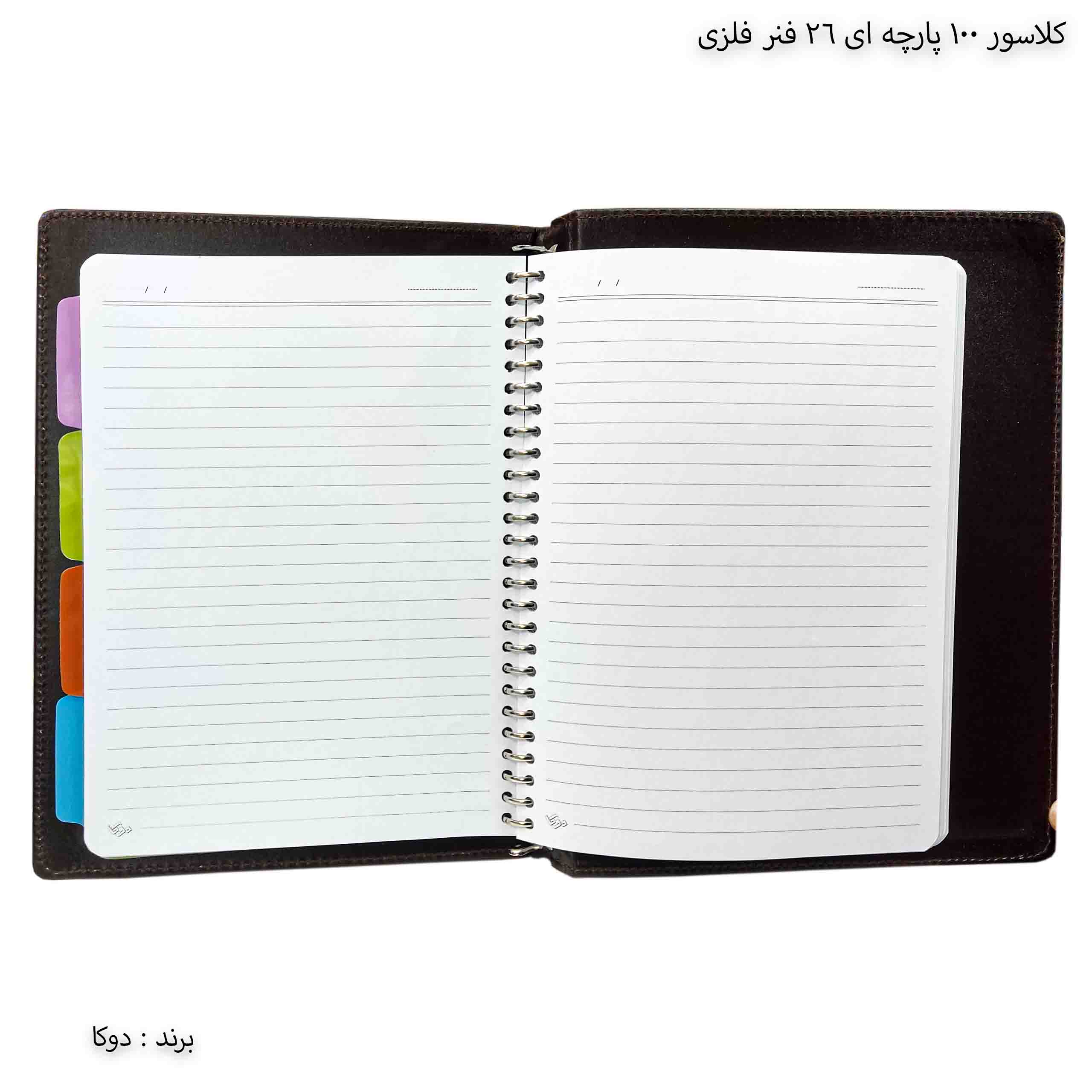 این دفتر کلاسوری بوده و به شما این امکان را می دهد تا نوشته ها و جزوه درس های مختلف خود را به کمک دیوایدر (جداکننده) موجود در آن دسته بندی نموده و برای هر درس بخشی جداگانه اختصاص دهید.